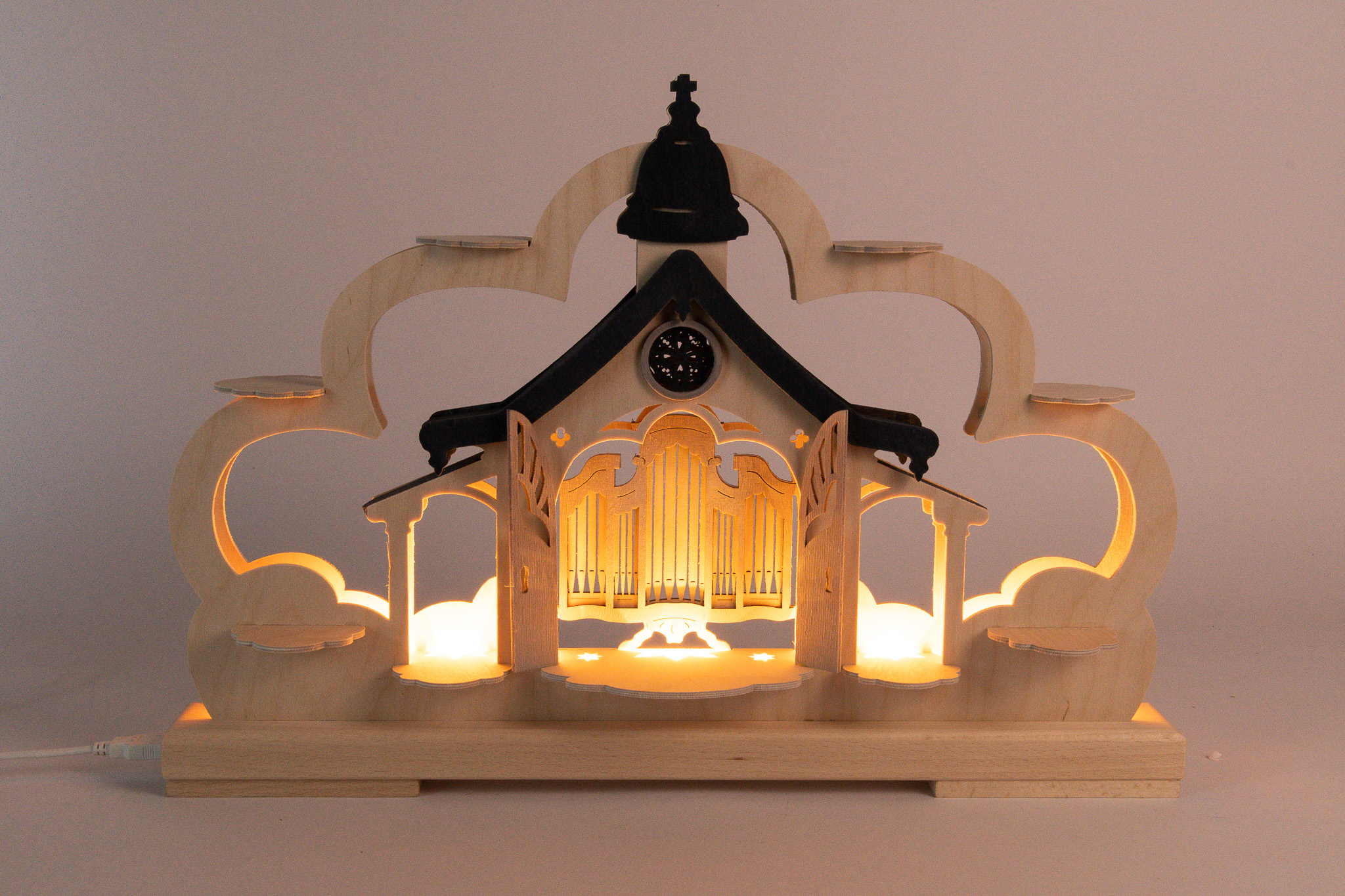 Dieser außergewöhnliche Holz-Schwibbogen verbindet traditionelle erzgebirgische Handwerkskunst mit einer innovativen Präsentationsidee für Sammler-Figuren. Im Mittelpunkt steht eine stilisierte Kirche mit geöffneten Türen und detailreich gestalteter Orgel, eingebettet in eine geschwungene Bogenform aus hellem Naturholz.