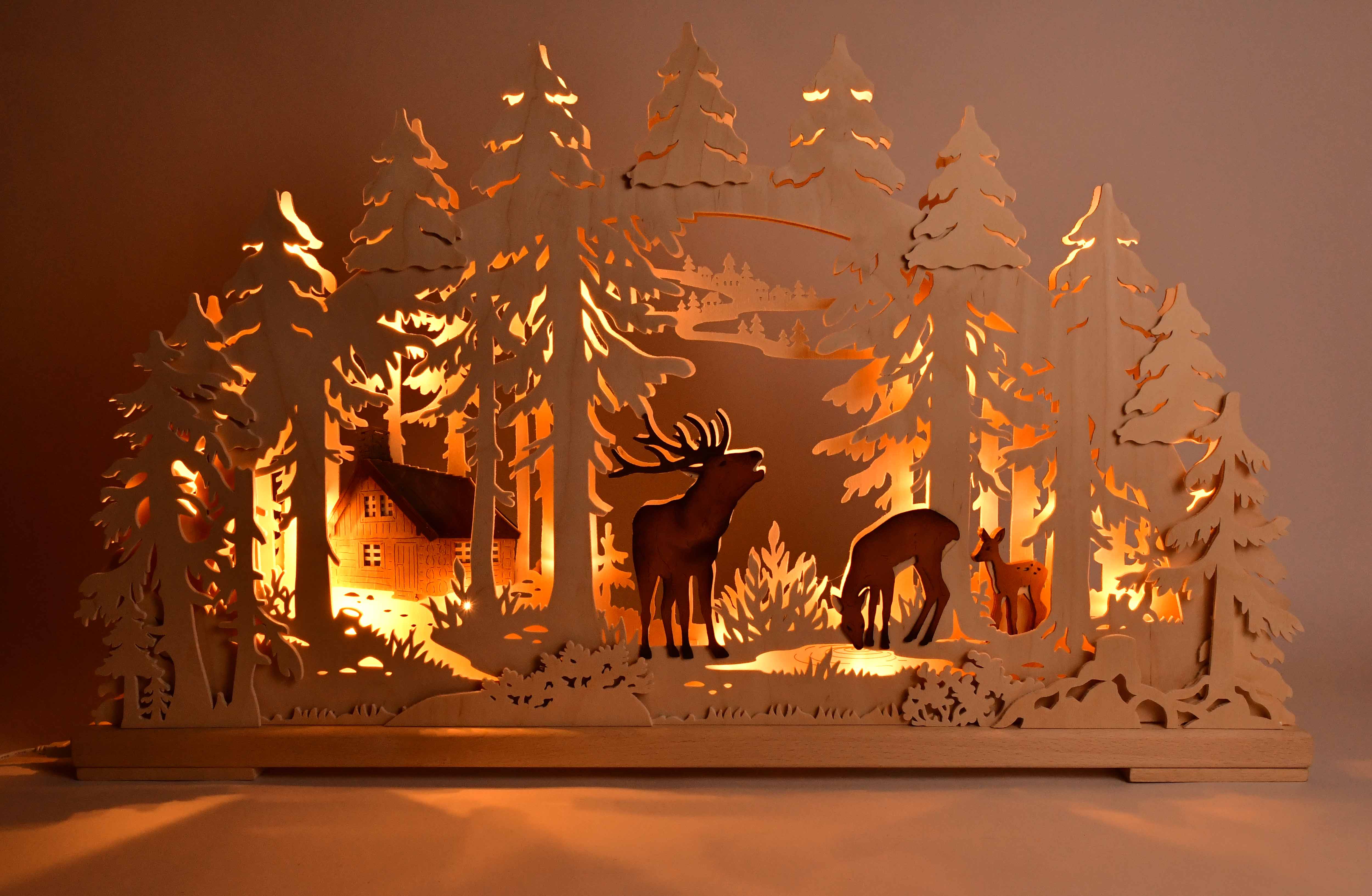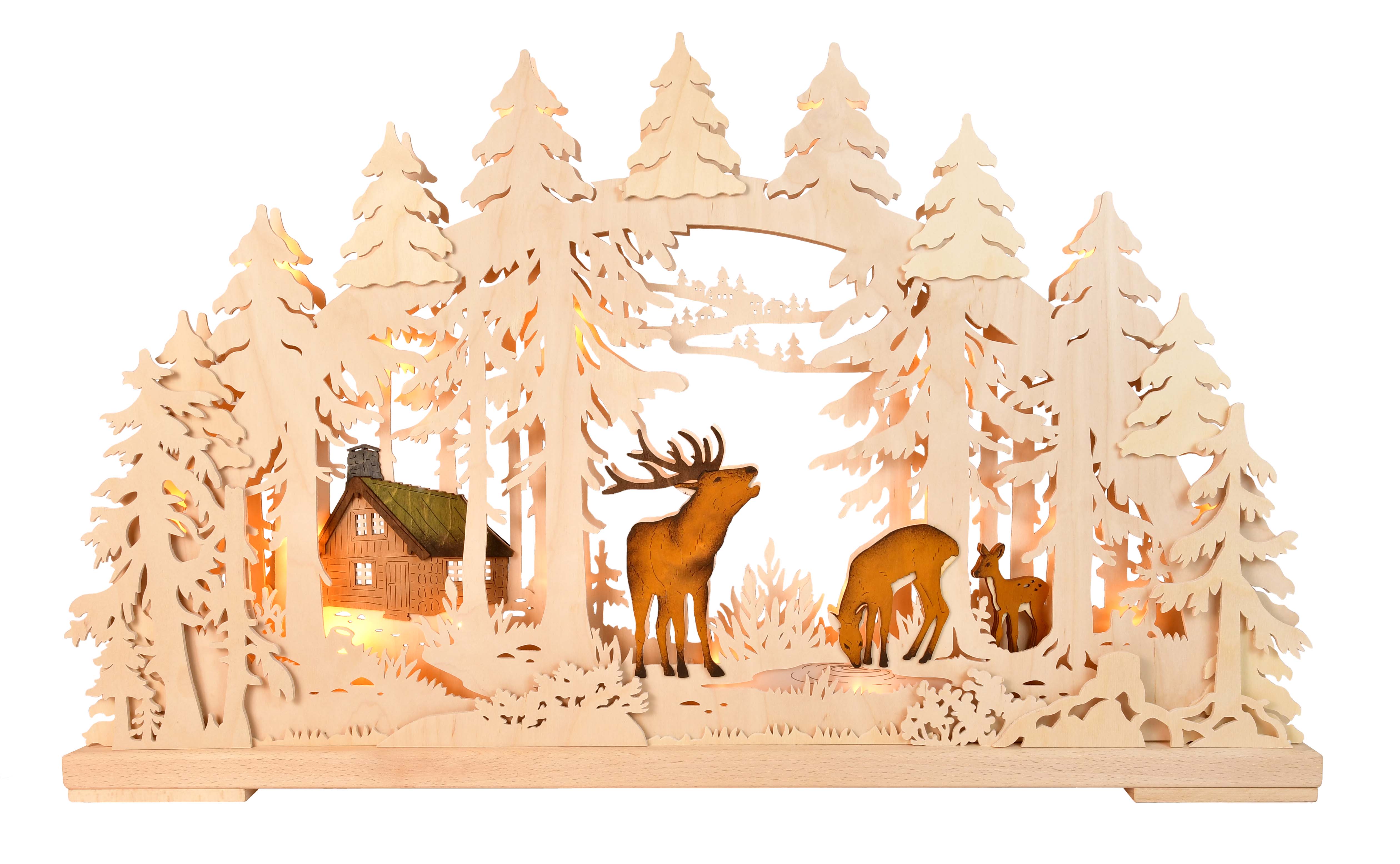 Dieser edle Schwibbogen mit Rehfamilie zeigt eine ruhige, naturverbundene Waldszene voller Harmonie. Am Ufer eines kleinen Teichs hat sich eine Rehfamilie versammelt: Vater, Mutter und ein Rehkitz trinken gemeinsam aus dem Wasser. Die friedliche Szene wird im Hintergrund von einer kleinen Jagdhütte ergänzt, die sich dezent in den Wald einfügt.