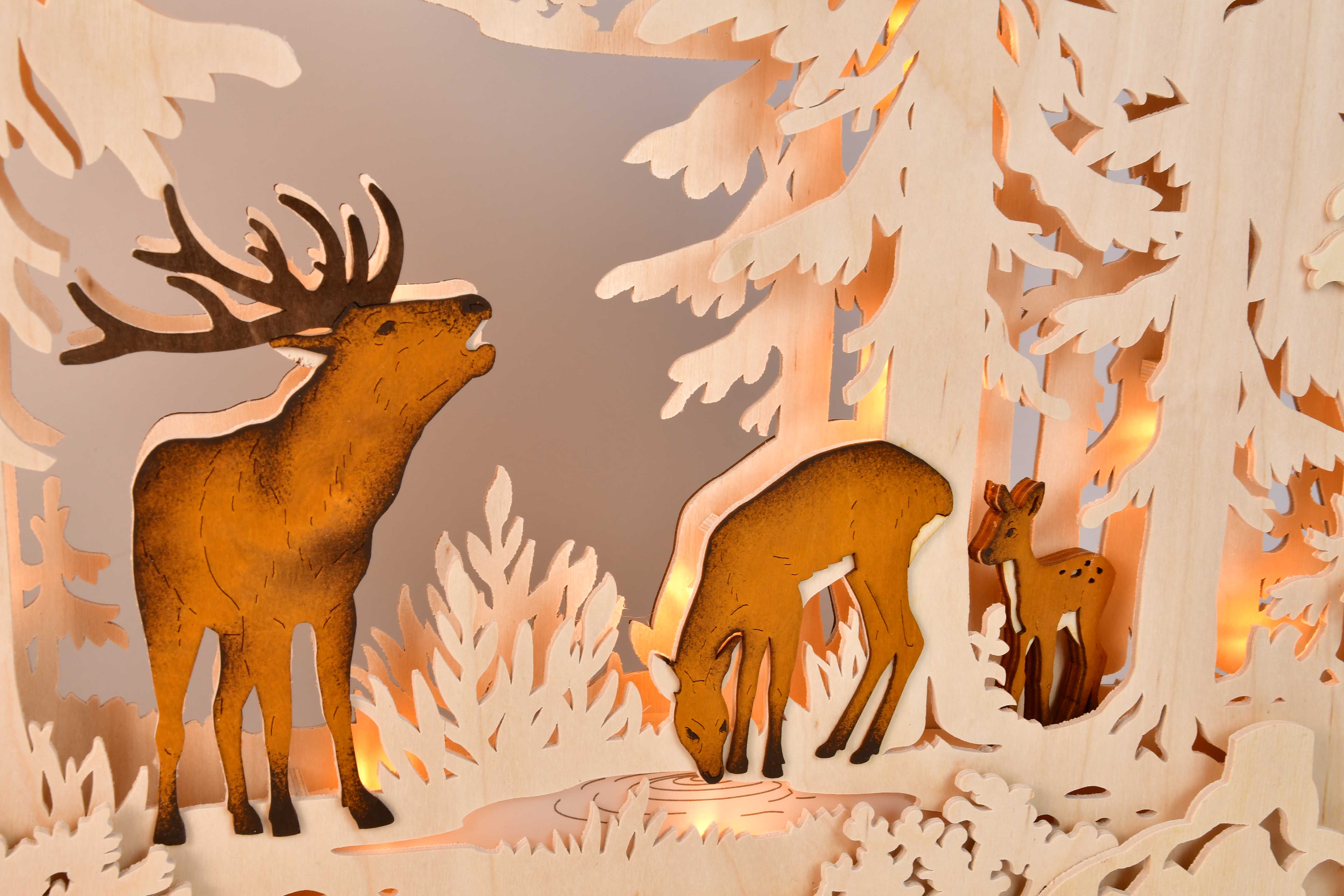 Die sanft colorierten Tierfiguren heben sich wirkungsvoll vom naturbelassenen Birkensperrholz ab und verleihen dem Schwibbogen eine besondere Tiefe und Eleganz. Die indirekte LED-Beleuchtung taucht die Szene in ein warmes, gemütliches Licht und sorgt für eine stimmungsvolle Atmosphäre in der Advents- und Weihnachtszeit.